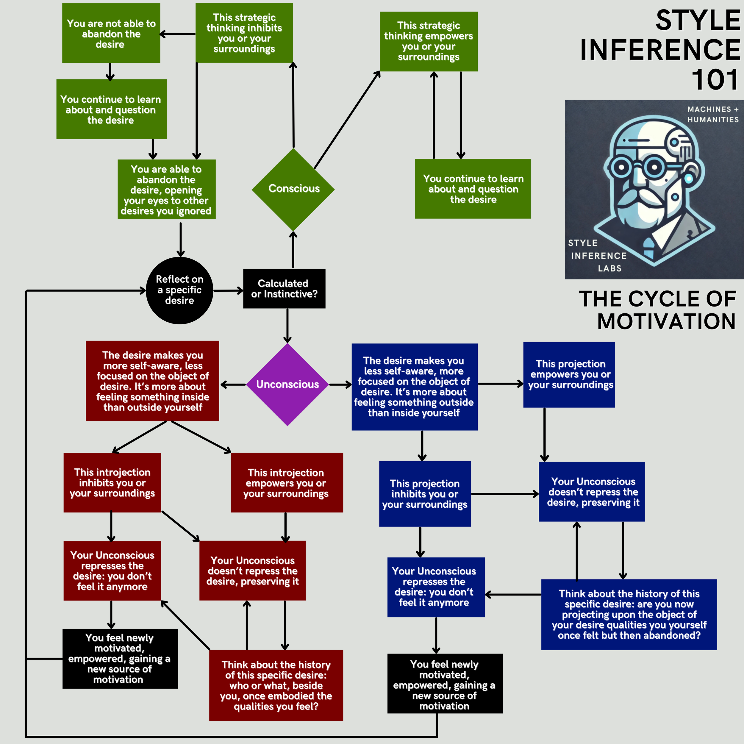 Through style inference, a tool from psychoanalysis where intelligence and instincts shake hands, people are equipped to tap into their instinct and complete its cycle of motivation. We offer organizations interactive workshops as introductions to style inference. We also partner with technology companies to design algorithms able to infer our deeper instincts and sensitive to the cycle of motivation - not the vicious cycles that trap users in compulsive loops of repetition, but those that help them grow and develop, moving from motivation to motivation.