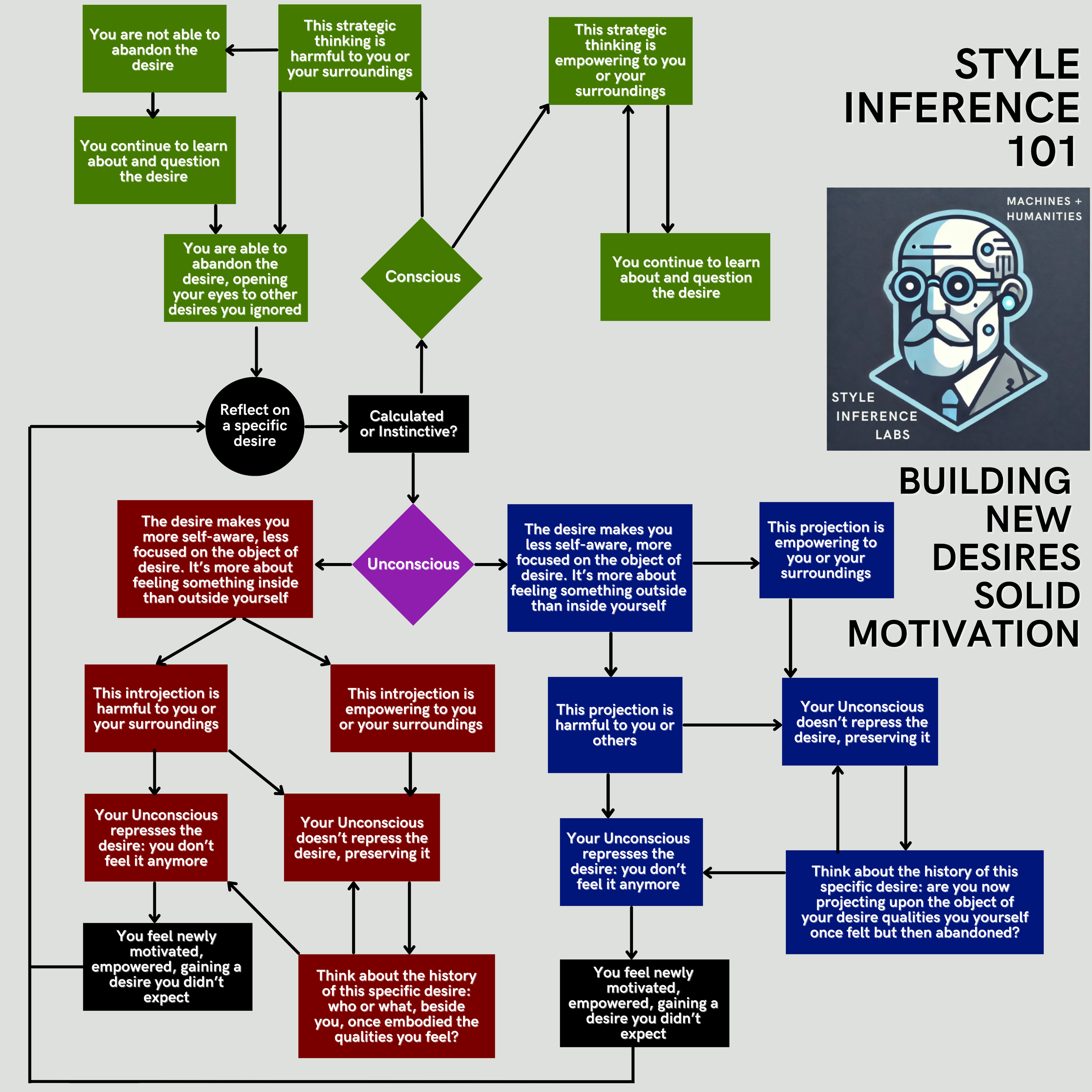 At Style Inference Labs, we understand that the type of work we are doing goes against the current. Why stop and reflect upon the past when the future seems so tempting? We understand we will not be able to convince everyone, let alone in the near future, about the need for style inference, psychoanalysis, or new ways to conceive desire, motivation, or the human.