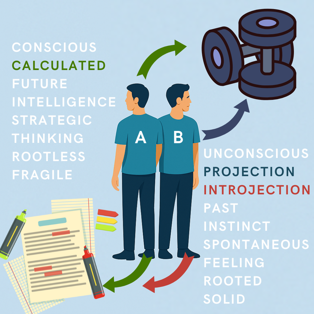 For example, consider Person A, who doesn’t feel motivated to study for long hours, nor to work out regularly. Person B, on the other hand, seems to do both effortlessly. According to Freud, Person A’s problem is that they are not projecting nor introjecting: they want to study or hit the gym, sure, but only as a means to an end, an intelligent calculation of future value. This may not be the case for Person B, who enjoys the same activity for its own sake, possibly because it stands for a piece of their individual past. In the case of introjection, Person B might have had a high school teacher they admired from a distance, only to one day lose that admiration by filling their shoes and embodying their approach. In the case of projection, Person B might have been used to spending evenings drawing, not working out, until their new urban life got in the way and made them lose their love for a calm environment.